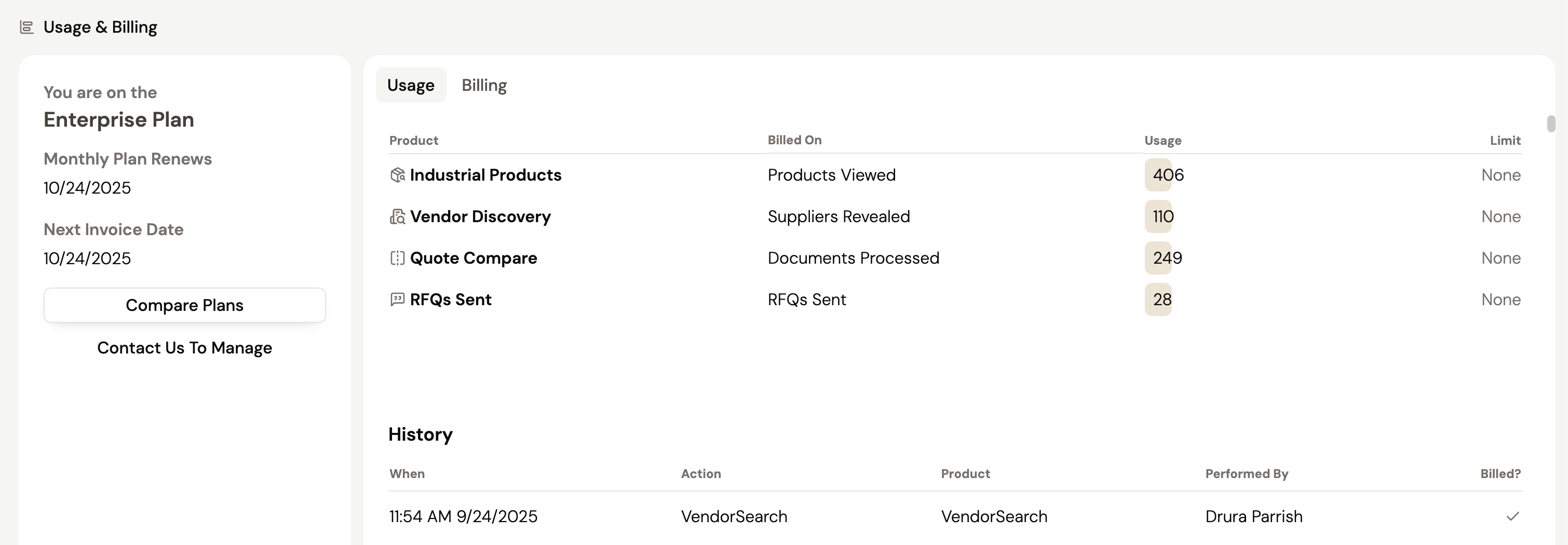 - Usage & Billing: Visit this guide to learn more about how to upgrade your plan, view your invoices, and more. This page is where you can update you plan, contact our team with any questions, and see your recent activity on Purchaser.