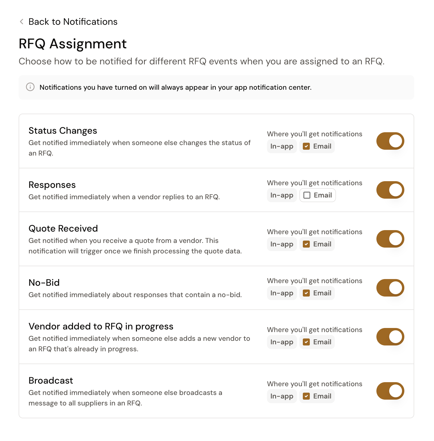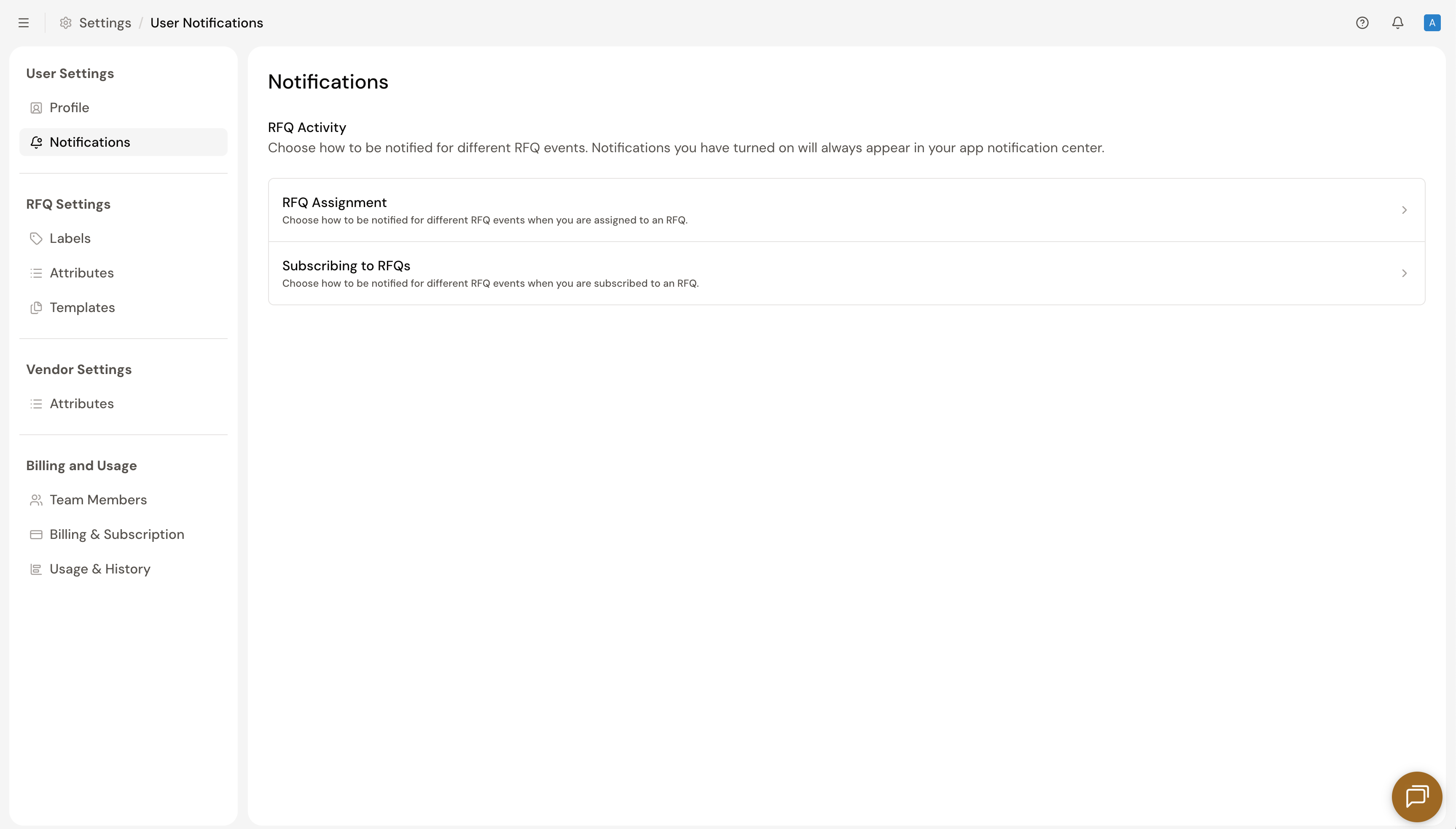 Receive alerts on important updates regarding RFQs that you are assigned to or ones that you are subscribed to. Purchaser enables you to stay on top of your alerts and customize which notifications are important to you. Notification settings are specific to individual users so each user will have control over their own settings.