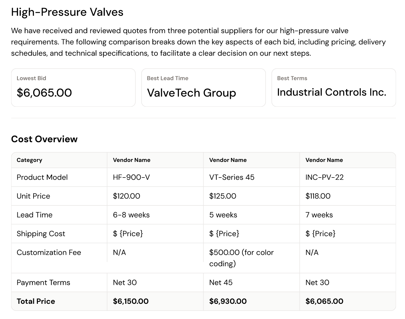 Our quote comparison tool analyzes your uploaded documents and consolidates them into a summary of the key differences between vendors and a side-by-side comparison of every line item highlighting the best options and potential savings so all your details are in one place.