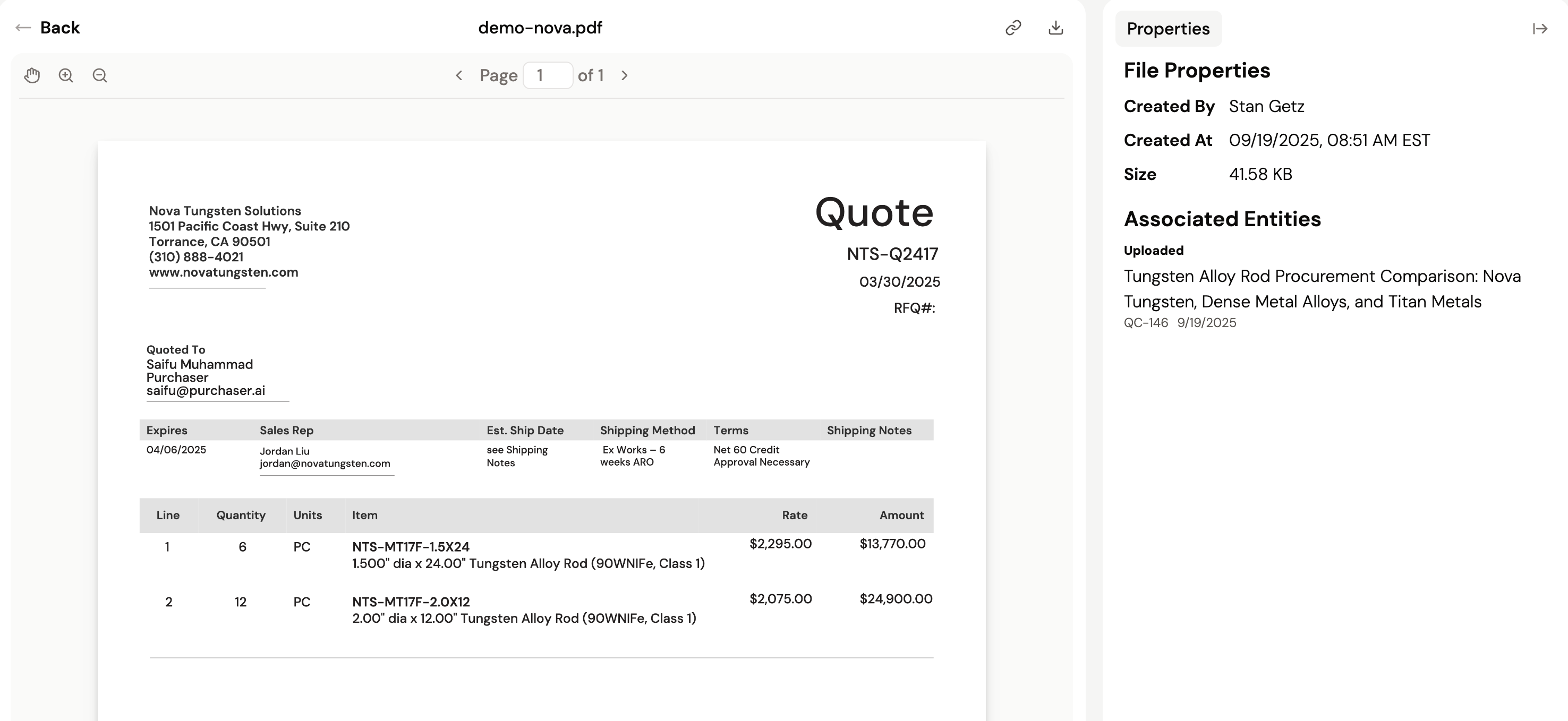 This is your central hub for all uploaded documents. You can upload additional quotes for this project or click on a document to view it and its properties.