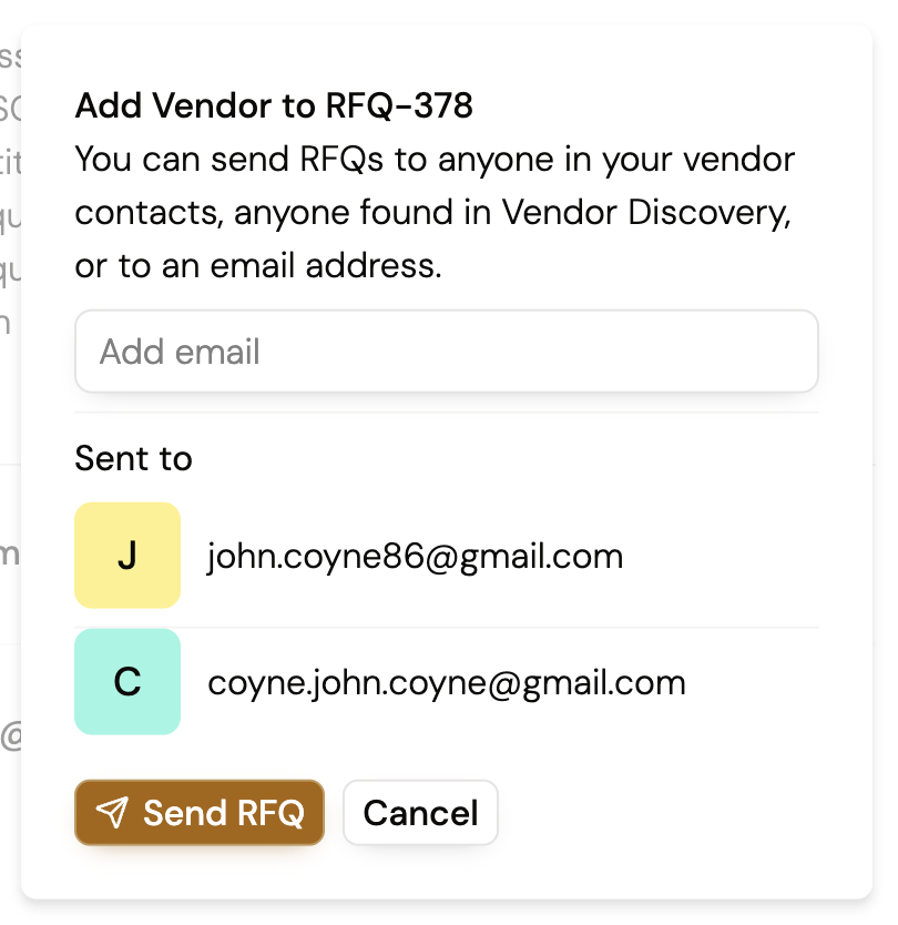 If you’ve already sent an RFQ, you can continue to add additional vendors to your RFQ by selecting the “Add a Vendor” option in the right panel of your RFQ Summary page.