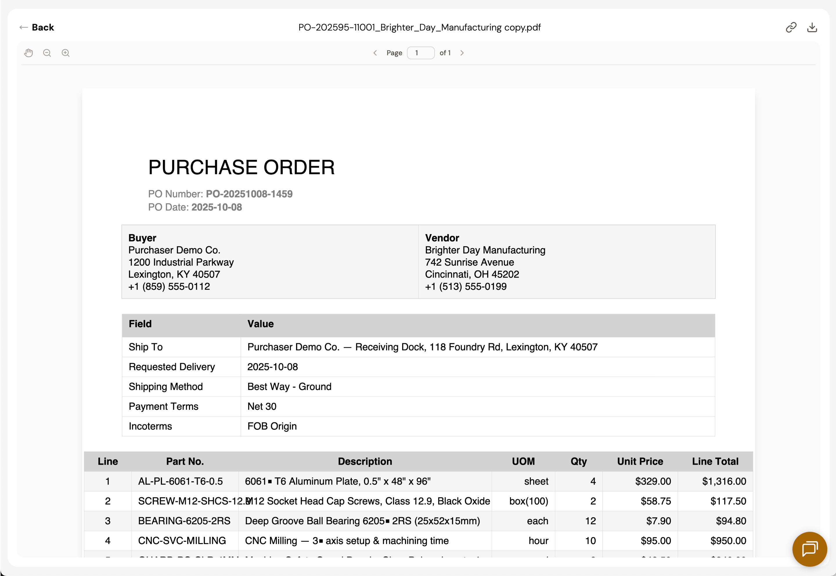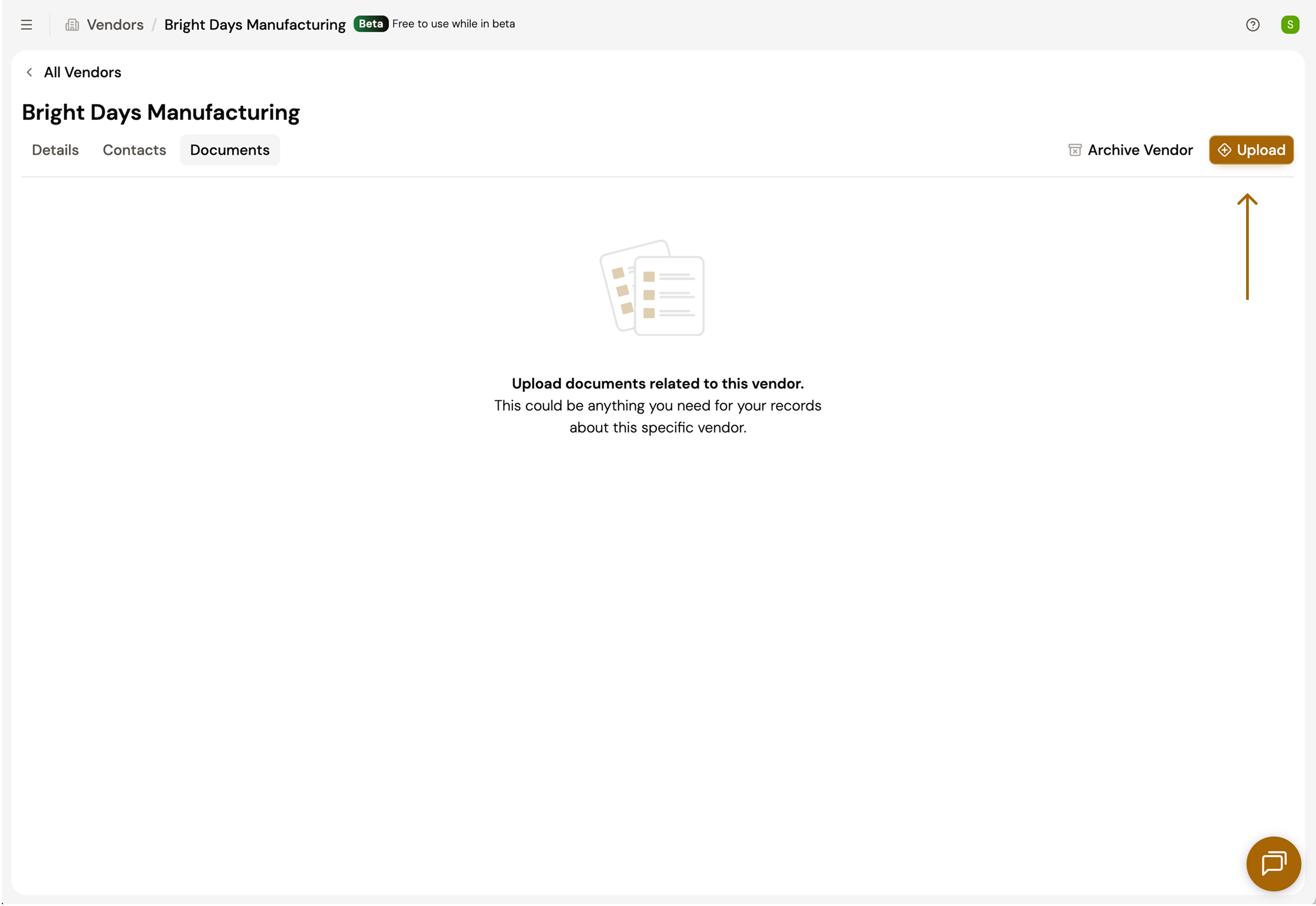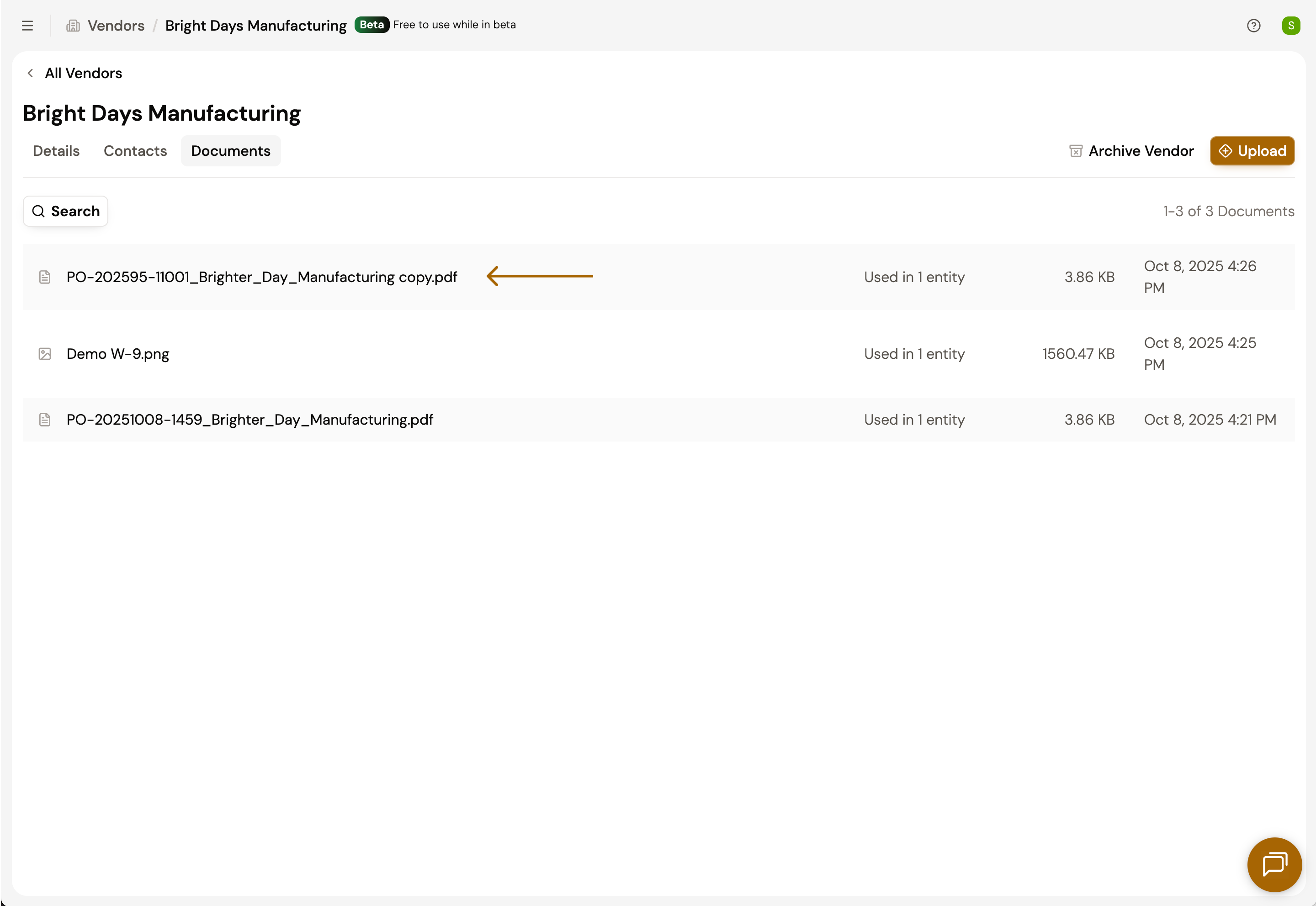 Attach documents and files to a vendor record to keep track of things like, vendor capabilities, product sheets, contract agreements, POs, and W9s, for example.
